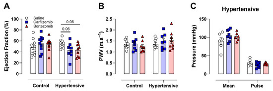 Notably, no differences were observed in LVEF in treated control mice (Figure 2A). Conversely, in hypertensive mice, both carfilzomib (p = 0.06) and bortezomib (p = 0.06) treatments showed a trend for a reduced LVEF (Figure 2A). This suggests that the administration of carfilzomib (8 mg/kg) or bortezomib (0.5 mg/kg) can potentially induce systolic cardiac dysfunction in hypertensive mice. The administration of either carfilzomib or bortezomib to control and hypertensive mice did not lead to changes in in vivo arterial stiffness, as assessed using PWV (Figure 2B). Mean blood pressure and pulse pressure, surrogate markers of arterial stiffness, did not show changes in hypertensive mice following carfilzomib or bortezomib treatment (Figure 2C), while the L-NAME treated groups (i.e., hypertension cohorts) showed increased blood pressure.