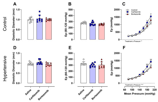 After in vivo evaluations, arterial stiffness was examined ex vivo following treatment with carfilzomib and bortezomib under physiological conditions in both control and hypertensive mice (Figure 3A–F). In control mice, no differences in diastolic diameters (Figure 3A) or arterial stiffness (Figure 3B) were reported at basal (i.e., 80–120 mmHg) pressure; however, a treatment interaction effect (p < 0.01) was noted in the pressure–stiffness relationship (Figure 3C). Similarly, evaluation in hypertensive mice revealed no differences in diastolic diameters (Figure 3D) or arterial stiffness (Figure 3E) at basal (i.e., 80–120 mmHg) pressure. Yet, treatment interaction effects (p < 0.0001) and treatment effects (p < 0.01) in the pressure–stiffness relationship (Figure 3F) were reported. Notably, carfilzomib experienced elevated (p < 0.01) arterial stiffness at the highest mean pressures (i.e., 180, 200 mmHg). Elevated basal stiffness values (80–120 mmHg) observed in saline-treated hypertensive mice compared to saline-treated control mice served as internal validation of our model (Ep controls: 279 ± 14 vs. Ep hypertensive: 329 ± 12 (p < 0.01)).