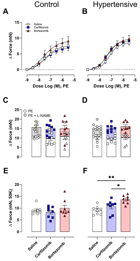 Following the ex vivo assessment of arterial stiffness, the impact of carfilzomib and bortezomib on vascular reactivity in the control and hypertensive mice was investigated. Neither carfilzomib nor bortezomib affected VSMC contractions induced by PE (Figure 4A,B). Additionally, maximal VSMC contractions in the presence and absence (Figure 4C,D) of NO did not demonstrate any treatment effects from carfilzomib or bortezomib. Moreover, NO-independent contractions stimulated by potassium (50 mM) in control mice revealed no treatment differences (Figure 4E). However, hypertensive mice demonstrated treatment disparities, with bortezomib resulting in heightened contractility (bortezomib vs. control, p < 0.01; bortezomib vs. carfilzomib, p < 0.05) (Figure 4F).