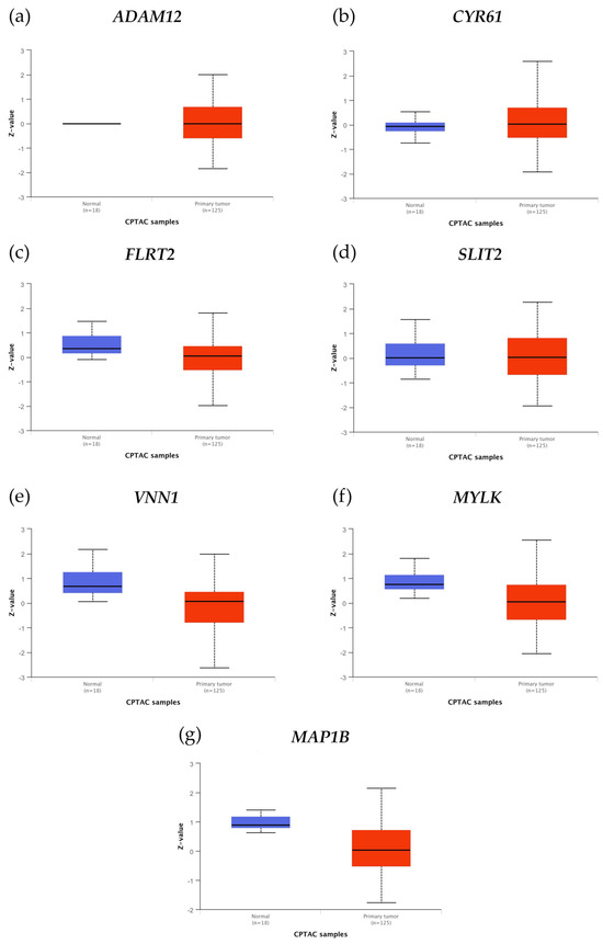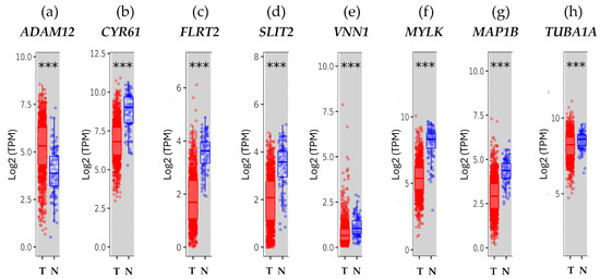 - Chandrashekar, D.S.; Bashel, B.; Balasubramanya, S.A.H.; Creighton, C.J.; Ponce-Rodriguez, I.; Chakravarthi, B.; Varambally, S. UALCAN: A Portal for Facilitating Tumor Subgroup Gene Expression and Survival Analyses. Neoplasia 2017, 19, 649–658. [Google Scholar] [CrossRef] [PubMed]