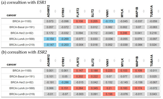 3.4. Correlation Between ESR1, ESR2, and Genes Associated with Cell Motility in Breast Cancer Subtypes