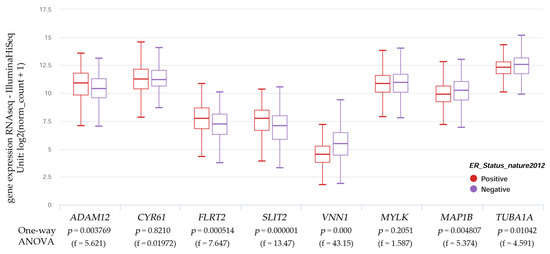 2.6. Gene Expression Related to Motility and Estrogen Receptor Status in TCGA Breast Cancer