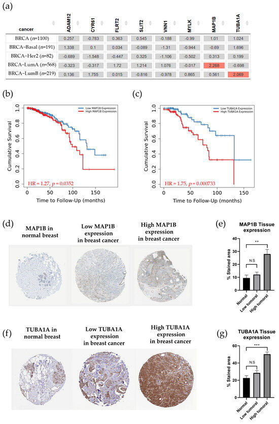 | TUBA1A | E/A3 > Ct, A5 | N > T | -- | ESR1: NS ESR2: NS | (−) | (+) LumB |