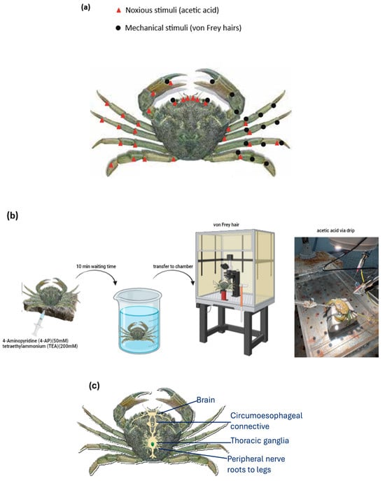 (a) Areas on the shore crabs (Carcinus maenas) where acetic acid and von Frey hair were applied to investigate the presence of nociceptors. The tissues examined included the eyes, the antennae, the antennules, the soft tissue between the claws, and the soft tissue at the joints of the pereiopods (n = 20). (b) A schematic of the timeline of the experimental protocol and areas where acetic acid or mechanical stimuli were applied on the shore crab. Initially, animals received an injection of neuromuscular blockers. Then, after the waiting time was over for the blockers to reach a full effect, animals were transferred into the chamber where electrophysiological recordings took place (copyright: picture of a shore crab, Victorian Fisheries Authority, https://vfa.vic.gov.au/operational-policy/pests-and-diseases/noxious-aquatic-species-in-victoria/european-shore-crab (accessed on 19 September 2024)). (c) A schematic of the nervous system of a shore crab (Carcinus maenas).