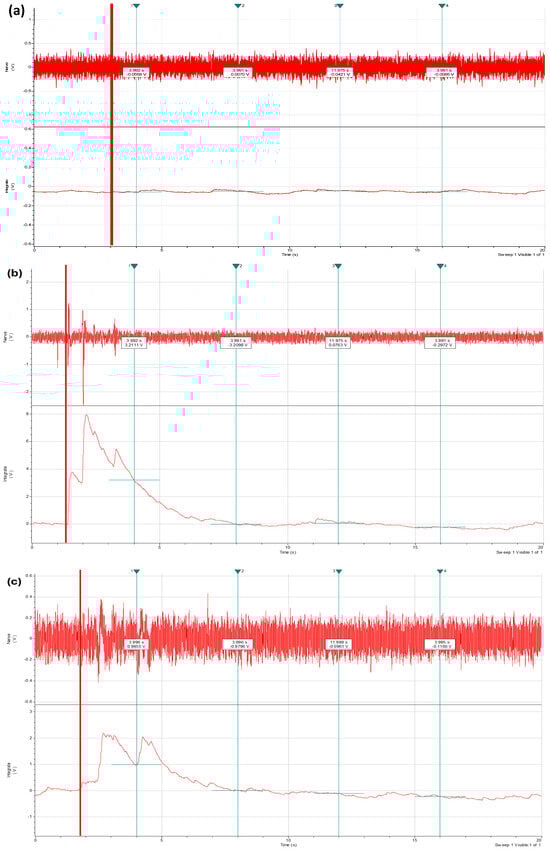 (a) Raw trace of response when seawater was applied on the legs; (b) raw trace of response when von Frey hair was applied on the claws; and (c) raw trace of response when acetic acid was applied on the legs (shore crabs, n = 20). The red vertical line represents the moment that the stimulus was introduced.