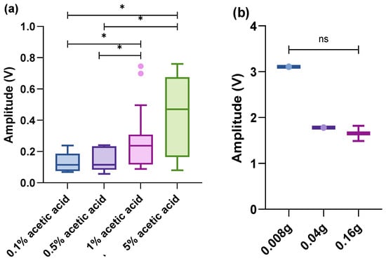 Box plot (within the box, the horizontal lines denote the median values; boxes extend from the 25th to 75th percentiles of each group’s values; the vertical extended lines represent the 95% range of values; and dots denote the outliers). A comparison of integrated amplitudes of the maximum amplitude per treatment. (a) Noxious stimulus (acetic acid) on the eyes (n = 35, responses); (b) mechanical stimulus (von Frey hairs) on the eyes (n = 4, responses) (ns p > 0.05; * p < 0.05).