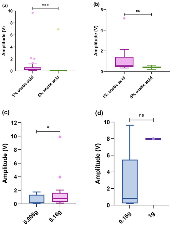 Box-plot (within the box, the horizontal lines denote the median values; boxes extend from the 25th to 75th percentiles of each group’s values; the vertical extended lines represent the 95% range of values; dots denote the outliers). Comparison of integrated amplitudes of the maximum amplitude per treatment after acetic acid on the (a) legs (n = 47, responses) and (b) claws (n = 15, responses). (c) Mechanical stimulus (von Frey hair) on the legs (n = 24, responses) and (d) on the claws (n = 6, responses) (ns p > 0.05; * p < 0.05; *** p < 0.001).