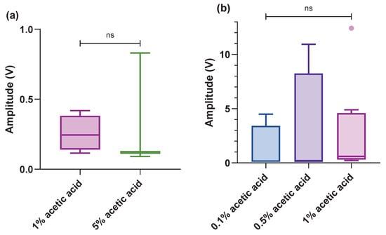 Box plot (within the box, the horizontal lines denote the median values; boxes extend from the 25th to 75th percentiles of each group’s values; the vertical extended lines represent the 95% range of values; dots denote the outliers). A comparison of integrated amplitudes of the maximum amplitude per treatment after acetic acid on the (a) antennae (n = 7, responses); (b) acetic acid on the antennules (n = 17, responses) (ns p > 0.05).