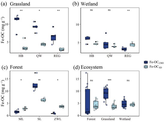 The results among the sample sites indicated that the Fe-OC contents determined by both methods were significantly different (p < 0.05) in the grassland ecosystem, with the CBD method yielding significantly higher values than the SD method (Figure 1a). In the wetland ecosystems, a significant difference between the Fe-OC contents of the two methods was observed only in the REG wetland, where the SD method reported significantly higher values than the CBD method (p < 0.05). However, no significant differences were found in the Fe-OC contents between the two methods in the HB and QW wetlands (p > 0.05, Figure 1b). In forest ecosystems, the Fe-OC extracted using both the CBD and SD methods was significantly different (p < 0.05) across all three samples. In ML and ZWL, the Fe-OC extracted by the SD method was significantly higher than that obtained by the CBD method (p < 0.05), while in SL the opposite trend was observed, with the CBD method yielding significantly higher Fe-OC values than the SD method (p < 0.05, Figure 1c). Overall, the Fe-OC content determined by the CBD method varied from high to low across ecosystems: 8.80 ± 2.43 mg g−1 in grassland, 5.01 ± 5.87 mg g−1 in forest, and 4.64 ± 1.54 mg g−1 in wetland. In contrast, the Fe-OC values obtained using the SD method were 4.41 ± 0.46 mg g−1 in wetland, 4.23 ± 1.64 mg g−1 in forest, and 3.64 ± 0.98 mg g−1 in grassland (Table S2). In grassland ecosystems, the difference in Fe-OC content between the two methods was highly significant, with the CBD method yielding values significantly higher than those from the SD method (p < 0.001). In contrast, no significant differences in Fe-OC content were observed between the two methods in wetland and forest ecosystems (p > 0.05, Figure 1d).