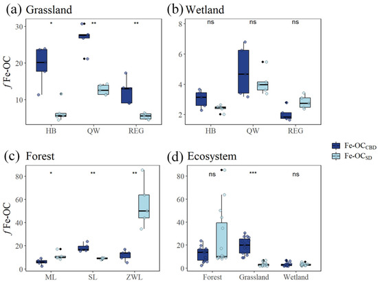 Differences in fFe-OC content extracted by the CBD and SD methods at three sampling sites in grassland, wetland, and forest ecosystems, and among the three ecosystems. fFe-OC: the Fe-OC contribution to SOC. “*” indicates significant differences at p < 0.05, “**” indicates significant differences at p < 0.01, and “***” indicates significant differences at p < 0.001, “ns” indicates no significant difference between.