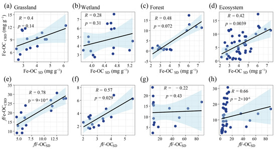 (a–c,e–g) show the correlation analyses between Fe-OC and fFe-OC determined by CBD and SD methods in grassland ecosystems, wetland ecosystems, and forest ecosystems, respectively; figures (d,h) show the correlation analyses between Fe-OC and fFe-OC determined by CBD and SD methods among all ecosystems. fFe-OCCBD: the Fe-OC, as determined by the citrate-bicarbonate-dithionite (CBD) method, contribution to SOC, fFe-OCSD: the Fe-OC, as determined by the sulfate-dithionite (SD) method, contribution to SOC.