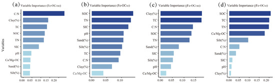 The results of the random forest model showed that the most important factor influencing the extraction of Fe-OC by the CBD method (Fe-OCCBD) was the C/N, with a 23.2% importance among all factors, followed by Clay% and TC with a 14.1% and 13.4% importance, respectively (Figure 4a). The most important factors influencing the extraction of Fe-OC by the SD method (Fe-OCSD) were SOC, TN, and SIC, with a 13.9%, 13.1%, and 12.3% importance, respectively (Figure 4b). The most important factors influencing Fe-OCCBD contribution to SOC are Clay%, TN, and C/N, with importance shares of 17.6%, 17.5%, and 13.8%, respectively (Figure 4c). The most important factors influencing the Fe-OCSD contribution to SOC were SOC, TC, TN, and Ca/Mg-OC, with importance percentages of 20.8%, 20.1%, 19.9%, and 17.8%, respectively (Figure 4d).