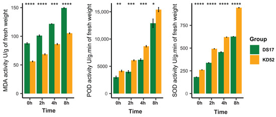 Physiological responses of cold-sensitive soybean variety DS17 and cold-tolerant variety KD52 under cold stress. Levels of damage indicators malondialdehyde (MDA) and protective enzymes superoxide dismutase (SOD) and peroxidase (POD) were measured at 0 (CK), 2, 4, and 8 h after cold treatment. Statistical analysis showed differences in physiological responses between DS17 and KD52 varieties at different time points during cold stress. *, **, ***, and **** indicate significant difference at p-value of <0.05, <0.01, <0.001, and <0.0001, respectively.