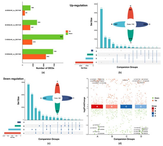Identification of key genes in response to cold stress by comparative transcriptome analysis. (a) DEGs between DS17 and KD52 varieties of soybean at different times (0, 2, 4, and 8 h) during cold stress. (b,c) Upset and flower graphs showing overlapped DEGs (up- and down-regulated genes) among different time points (0, 2, 4, and 8 h after the initiation of cold treatment). Letters from A, B, C, and D indicate the four comparison groups KD52-0H_vs._DS17-0H, KD52-2H_vs._DS17-2H, KD52-4H_vs._DS17-4H and KD52-8H_vs._DS17-8H, respectively. A total of 234 DEGs (112 up-regulated (b) and 122 down-regulated (c)) in common. (d) Key differential gene expression analysis shows significantly up- and down-regulated genes across all four comparison groups. A log2FC > 1 and p-value < 0.05 is indicated as significantly up-regulated in red, while alog2FC < −1 and p-value < 0.05 is indicated as significantly down-regulated in green. A total of 42 key genes, which are located at the top and bottom of the volcano plot, were obtained.