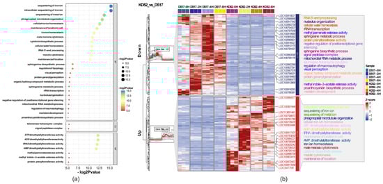Functional classification and enrichment analysis of differentially expressed genes (DEGs) during cold stress. (a) Bubble chart depicting gene ontology (GO) terms enriched in 234 cold-responsive DEGs. The x-axis represents the negative log of p-values, and the y-axis displays GO categories, with bubble size indicating the number of DEGs associated with each term. The gradient color scheme indicates the magnitude of the p-values, with blue colors representing higher significance and red colors indicating lower significance. (b) Clustering heatmap illustrating DEG expression patterns during cold exposure. Of the DEGs, 112 were up-regulated and 122 were down-regulated in the cold-tolerant KD52 compared with the cold-sensitive DS17 at 0, 2, 4, and 8 h. A total of 35 enriched GO terms were identified, comprising 15 up-regulated and 20 down-regulated categories.