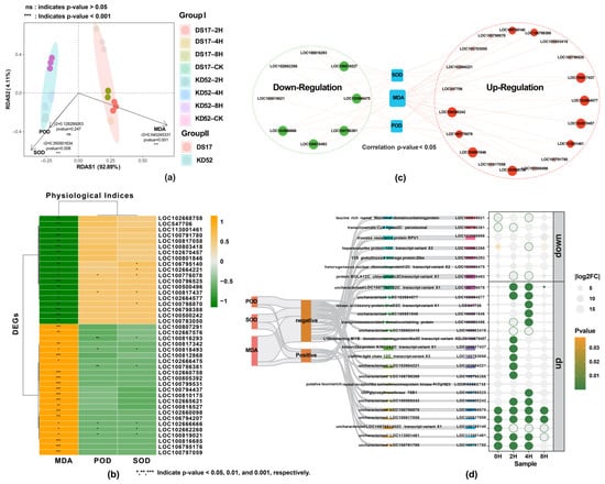 We conducted association analysis (Figure 4) to uncover relationships between the two cultivars under the four cold stress treatments with different physiological parameters (POD, SOD, and MDA). The findings showed that redundancy analysis (RDA) clearly showed the difference between the cold-tolerant cultivar KD52 and the cold-sensitive cultivar DS17 (Figure 4a). The RDA biplot shows connections by lining up the cold-tolerant KD52 cultivar with the POD and SOD vector directions, which suggests that there are positive correlations. Conversely, the DS17 cultivar, which is susceptible to cold, was correlated with the MDA vector, indicating a strong connection with membrane degradation. The cultivar KD52 showed a positive correlation with POD (r2 = 0.128, p = 0.247) and SOD (r2 = 0.350, p = 0.008), indicating a remarkable association between antioxidant gene activation and enzymatic activity. In contrast, the DS17 cultivar significantly and positively correlated with MDA levels (r2 = 0.540, p = 0.001), linking membrane damage with altered gene expression.