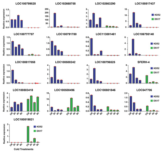 Expression dynamics of cold-responsive genes in soybean cultivars under progressive cold stress. The graphs depict relative transcript levels for 17 genes in KD52 and DS17 cultivars, comparing control conditions (CK, 0 h) with cold treatments lasting 2, 4, and 8 h. Relative transcript abundance represents gene expression levels.