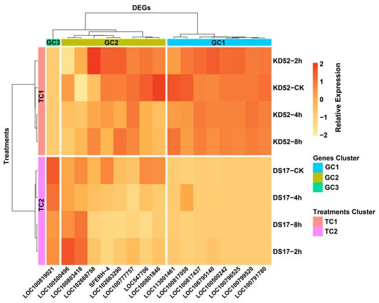 Consequently, we conducted clustering heatmap visualization using the relative expression levels across all genes for the two cultivars subjected to 0, 2, 4, and 8 h of cold treatment (Figure 6). The results indicated distinct patterns of up- and down-regulation associated with cultivar, treatment duration, and their interaction. The heatmap clustering consisted of three distinct clusters: C1, C2, and C3. In cluster C1, there were seven genes—LOC100799520, LOC100791780, LOC100796525, LOC100500242, LOC106795140, LOC100817058, LOC100817437, and LOC113001461—that were mostly turned on in KD52 after 2–8 h of cold stress compared with DS17. This strong activation suggests that these genes are very important in KD52’s early cold response mechanisms. They may help with things like changing the membrane, activating transcription factors, and breaking down carbohydrates, all of which protect against low temperatures.