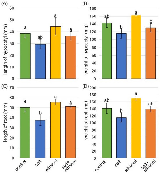 Effect of ethanol on soybean morphology under salt stress. Three-day-old soybean seedlings were treated with or without 300 mM of ethanol as well as with or without 150 mM of NaCl for 2 days. At 5 days after sowing, the hypocotyl length (A), hypocotyl-fresh weight (B), taproot length (C), and total-root fresh weight (D) were measured as morphological parameters. Data are presented as mean ± SD from 3 independent biological replicates. The means of points with different letters are significantly different according to a one-way ANOVA followed by Tukey’s multiple comparison test (p < 0.05).