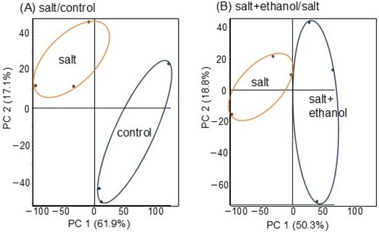 Summary of soybean-proteomic data based on principal component analysis. Three-day-old soybean seedlings were treated with or without 300 mM of ethanol as well as with or without 150 mM of NaCl for 2 days. Soybean roots were collected for protein extraction. Proteomic analysis was conducted in 3 independent biological replicates for each treatment. Principal component analysis was performed in Proteome Discoverer using proteins from 6 different kinds of samples from salt/control (A) and salt + ethanol/salt (B).