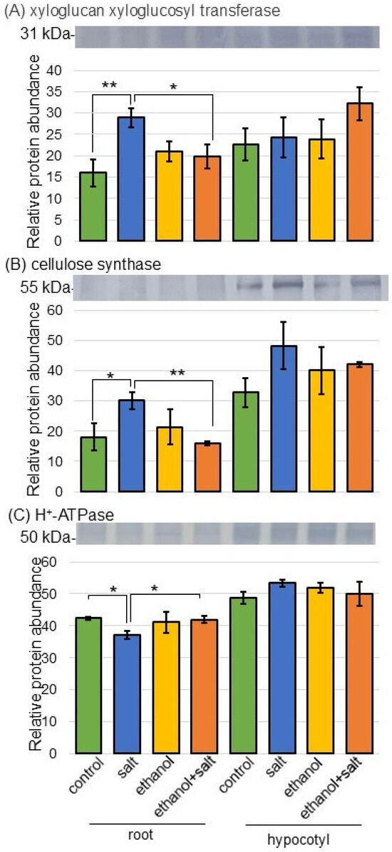 Based on proteomic analysis, because cell wall and membrane-associated proteins were significantly increased and restored by ethanol application, this result was confirmed using immunoblot analysis (Figure 6). In the proteomic results, cellulose synthetase, plasma membrane ATPase, and xyloglucan endotransglucosylase/hydrolase were significantly altered (Figures S1 and S2); especially, cellulose synthetase I1LU34 (Figure S1) increased with salt stress and decreased with ethanol application under stress (Figure S2). In the immunoblot results, xyloglucan xyloglucosyl transferase and cellulose synthetase accumulated in the roots with salt treatment and were restored to the control level by ethanol treatment, even with salt stress (Figure 6A,B). On the other hand, the accumulation of H+-ATPase in the roots was decreased under salt stress but was recovered to the control level by ethanol application, even under stress (Figure 6C).
