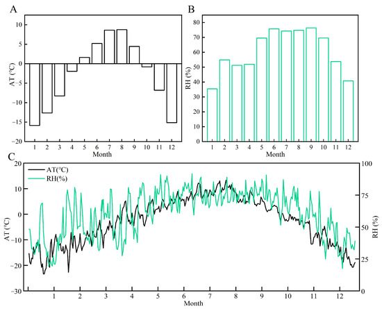 As shown in Figure 2, the annual average air temperature in the experimental area for 2023 was −2.7 °C, with a monthly maximum of 8.7 °C in August and a minimum of −15.9 °C in January (Figure 1A,C). The annual average relative humidity was 60.7%, with higher monthly relative humidity observed from June to September, recorded at 75.7%, 74.3%, 74.8%, and 76.4%, respectively (Figure 1B,C).