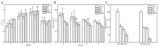 The changes in soil temperature and soil volumetric water content in the experimental area from June to September 2023 are shown in Figure 2. Under the four treatments, soil temperature exhibited a trend of initially increasing and then decreasing (Figure 3A). The average soil temperatures for W, RR, RRW, and CK treatments were 9.3 °C, 8.3 °C, 9.7 °C, and 8.7 °C, respectively. Notably, the soil temperature in the RRW treatment was significantly higher than that in the W treatment, indicating that the warming treatment had a more pronounced effect during low temperatures. The soil volumetric water content showed a gradual decreasing trend under all four treatments (Figure 3B), with the order of soil volumetric water content being RRW < RR < W < CK. Both the RR and RRW treatments significantly reduced soil volumetric water content (p < 0.05), while the W treatment exhibited a decrease, but the difference was not significant (p > 0.05). In terms of aboveground biomass (Figure 3C), the W, RR, and RRW treatments significantly reduced aboveground biomass by 48%, 77%, and 58%, respectively, compared to CK (p < 0.05). The belowground biomass decreased by 51.94%, 54.08%, and 88.91%, respectively, under the same treatments.