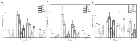 Effects of warming and thermokarst on soil respiration rate. (A) Soil respiration rate; (B) autotrophic respiration rate; (C) heterotrophic respiration rate. Note: CK: control; W: warming; RR: thermokarst; RRW: warming treatment of thermokarst. Different letters indicate significant differences between treatments (p < 0.05).