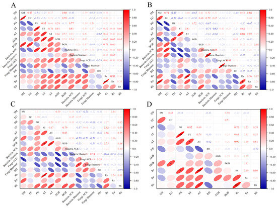 Figure 5 shows that under the four treatments, soil respiration rate and heterotrophic respiration rate are significantly positively correlated with both soil temperature and air temperature. The soil autotrophic respiration rates for CK, W, and RRW also exhibit significant positive correlations with soil temperature and air temperature (p < 0.05). Under W and RR treatments, autotrophic respiration rate is positively correlated with soil volumetric water content. Additionally, in the CK treatment, the bacterial ACE index and Shannon index, along with the fungal ACE index, are positively correlated with soil respiration, while the Shannon indices of bacteria and fungi in RR and W treatments show negative correlations with soil respiration rate, but these are not significant (p > 0.05). Additionally, soil temperature shows a significant positive correlation with air temperature under all four treatments (p < 0.05). In CK and W treatments, soil volumetric water content is significantly positively correlated with electrical conductivity (p < 0.05). The bacterial ACE index in CK is positively correlated with pH, soil temperature, air temperature, and aboveground biomass, while soil volumetric water content is significantly positively correlated with underground biomass (p < 0.05). Under the W treatment, soil pH shows a significant negative correlation with soil volumetric water content and electrical conductivity, while soil temperature is significantly positively correlated with air temperature (p < 0.05). The bacterial ACE index and Shannon index are positively correlated with electrical conductivity, but negatively correlated with soil temperature and air temperature (p < 0.05). Under the RR treatment, underground biomass is positively correlated with soil temperature, air temperature, and soil respiration rate (p < 0.05). In the RRW treatment, soil pH shows significant positive correlations with soil temperature, soil respiration rate, and its environmental factors, while soil temperature is significantly positively correlated with air temperature (p < 0.05).