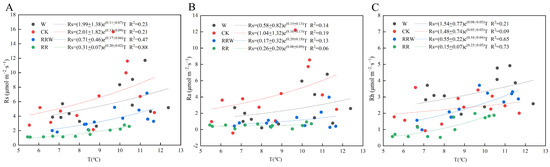 Nonlinear fitting of soil respiration rates and their environmental factors with soil temperature under different treatments; (A) soil respiration rate; (B) soil autotrophic respiration rate; (C) soil heterotrophic respiration rate.