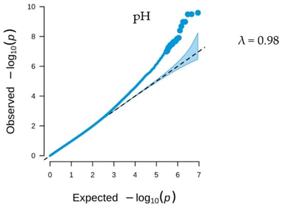 Shows the Q-Q plot for the genome-wide association analysis of meat pH in Sichuan white geese. The x-coordinate represents the negative logarithm of the expected p-value. The y-coordinate represents the negative logarithm of the actual observed p-value, and the diagonal represents the predicted line. The scatter in the lower left corner of the Q-Q plot indicates sites of low significance, and the near coincidence of the lines in the lower left corner indicates that the analysis model is reasonable. When the scatter is above the diagonal line, it indicates that these sites are significantly correlated with the traits.