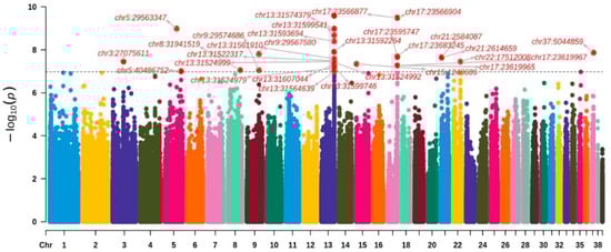 Genome-wide association studies (GWASs) have become pivotal in linking single nucleotide polymorphisms (SNPs) with functional genes, widely applied in poultry and livestock to identify economically significant traits [13]. Demonstrating high accuracy and efficiency, GWASs have identified numerous causal variants and genes across various farm animals, producing comprehensive association profiles that enhance breeding programs, leading to significant achievements in cattle [14], sheep [15], pigs [16], chickens [17], and geese [18], providing a theoretical basis for future molecular breeding and meat quality improvements. Additionally, GWASs have facilitated the rapid localization of quantitative trait loci (QTL) and the identification of candidate genes related to meat quality traits [19]. For instance, in bovine studies, a QTL on chromosome 14 affecting meat pH has been identified, encompassing differentially expressed genes such as FABP, CAPN1, and CAST, which play crucial roles in beef maturation and carcass quality [20]. Research has also highlighted the SOX6 gene as critical for chicken breast muscle development, identifying a haplotype containing 16 SNPs [21], and the ABCG2 gene has been implicated in modulating egg color [22,23]. Furthermore, significant loci linked to disease resistance have been identified, offering new insights into the genetic determinants of health [24]. Our laboratory’s recent advancements include identifying numerous genes associated with reproduction, egg quality, meat quality, and body composition using SNP-GWAS and PAV-GWAS methodologies [25,26,27].