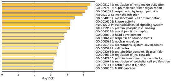 In this study, the GO enrichment analysis of all SNPs related to pH traits showed that SNPs associated with pH traits of Sichuan white geese were mainly enriched in the regulation of lymphocyte activation (GO:0097435, 16/592, −LogP = −5.24) and in response to hydrogen peroxide (GO:0042542, 7/101, −LogP = −5.09), Salmonella infection (GO: hsa05132, 10/247, −LogP = −4.93), and other metabolic processes (Figure 3, Table 6 and Supplementary Tables S6–S8).