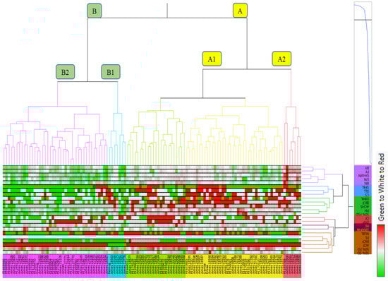 Sixty-six genotypes and two cultivars (Erbaa and Gamze) took place in group A, and 45 genotypes and three cultivars (Arslan, Pelmus, and Gürbüz) took place in group B. Group A is divided into two subgroups, A1 and A2. There were 59 genotypes and two cultivars (Erbaa and Gamze) in subgroup A1. Among the 59 genotypes in this group, 50 genotypes were determined to be Ames-coded genotypes, and 9 genotypes were determined to be PI-coded genotypes. There were seven genotypes in the A2 subgroup. These nine genotypes consist of genotypes originating from Israel, the Netherlands, Germany, the USA, Tajikistan (2), and Ethiopia.
