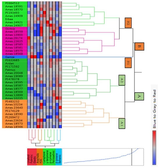Figure 2 showed that cluster analysis divided into two A and B main groups for coriander genotypes and cultivars based on the fixed oil, major essential oil compositions, and major fixed acids. While most of the coriander genotypes took place in the A main group, three cultivars (Erbaa, Gürbüz, and Gamze) were found in the B main group. These main groups are also divided into two subgroups: A1, A2, B1, and B2. The subgroup A1 contained nine genotypes, and subgroup A2 contained 11 genotypes and 2 cultivars (Arslan and Pelmus). The subgroup B1 included only the Gamze cultivar, and the subgroup B2 included 15 genotypes and two cultivars (Erbaa and Gürbüz). The B1 subgroup was separated with the values of the fixed oil acids as palmitic, elaidic, and petroselinic. The A1 subgroup was separated from the other groups with β-Pinene essential oil composition and behenic acid.