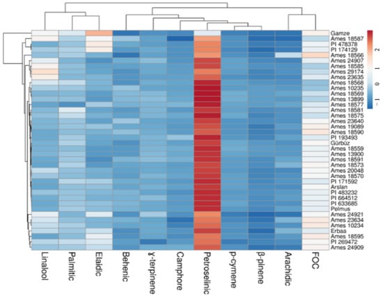 Heat map analysis result of the selected coriander genotypes depending on the examined properties. From orange to red (between 1 and 2) colors indicate higher data values, and from light shades of blue (between 0 and 1) to blue (between −1 and 0) colors represent lower data values.