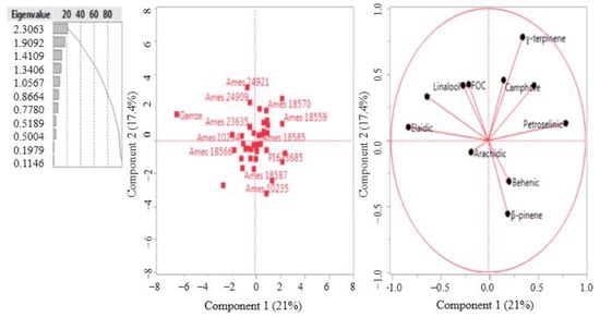 From five principal components, PC 1 to PC5, extracted from the original data and having an eigenvalue greater than one, accounting for 72.94% of the total variation, suggesting that these principal component scores might be used to summarize the original 11 variables in any further data analysis (Figure 4). Accordingly, the first principal component had high positive coefficients for petroselinic acid. The major contributing character for the diversity in the second principal component (PC2) was linalool, while the third principal component (PC3) was fixed oil content. The fourth principal component contributed diversity for the character of arachidic acid. The fifth principal component was palmitic and behenic acid. On the basis of PCA, most of the important quality properties for the selected genotypes were presented in PC1, PC2, PC3, and PC4. A high PC score for a particular genotype in a particular component showed high values for the variables in that particular genotype.