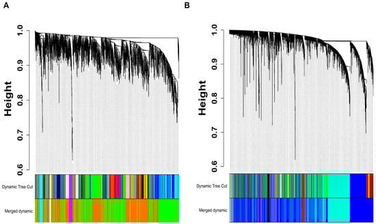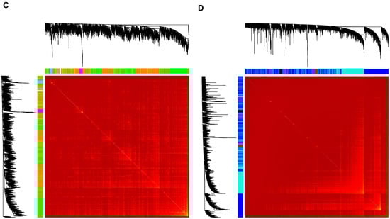 The expression data of and AS-specific DEGs were utilized as an input for WGCN establishment post noisy DEGs and sample outliers elimination corresponding to GSE28829 and GSE43292 datasets, respectively. The WGCNs were generated at (corresponding to ) and (corresponding to ) in the case of GSE28829 and GSE43292. Figures S1 and S2 show plots for in consideration of scale-free topology (SFT) criteria corresponding to GSE28829 and GSE43292. The clustering dendrogram (hierarchical) and dynamic tree cut (DTC) algorithm resulted in and modules corresponding to GSE28829 and GSE43292. Tables S1 and S2 list the modules and their DEG counts in the case of GSE28829 and GSE43292. ME dendrograms were cut at a height of equivalent to a correlation of to merge highly co-expressed gene pattern modules in the case of GSE28829 and GSE43292. Post-merging, we obtained a total of modules corresponding to GSE28829 and GSE43292 each (Figure 2A,B). Tables S3 and S4 list the modules and their DEG counts in the case of GSE28829 and GSE43292 post-merging. Since the gray module comprised unassigned DEGs, we eliminated it for further analysis. WGCN plots in Figure 2C,D capture the topological overlap matrix (TOM) information for all module genes post-merging in the case of GSE28829 and GSE43292. In total, and module DEGs corresponding to GSE28829 and GSE43292 were retained for further analysis.