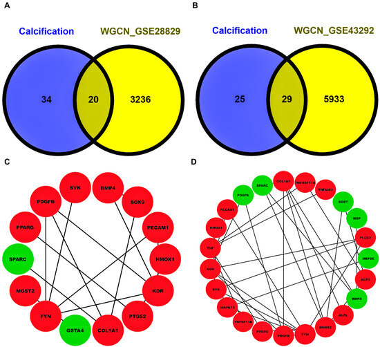 Venn plots showing overlapping and CASS-DEGs in the case of (A) GSE28829 and (B) GSE43292. Blue- and yellow-colored areas signify genesets corresponding to calcification and DEGs obtained from WGCN for both cohorts. Undirected and unweighted PPINs comprise nodes interacting with edges for (C) GSE28829, while nodes interact with edges for (D) GSE43292. Red- and green-colored nodes imply an upregulated and downregulated expression status of DEGs.