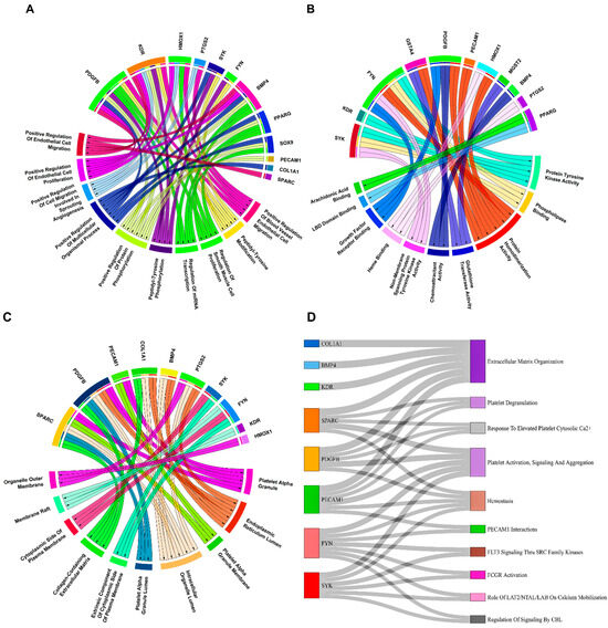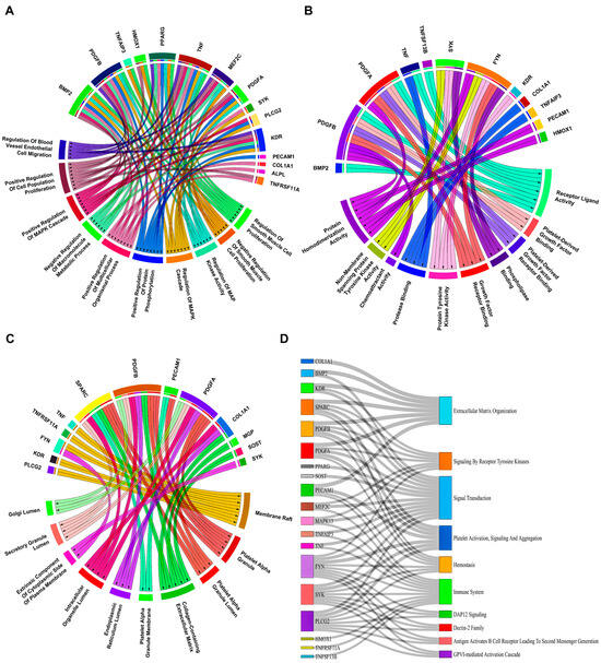 Linkage of top significant (A) GO–BP, (B) GO–MF, (C) GO–CC terms (D) pathways with PPIN-participating CASS-DEGs corresponding to GSE43292 displayed by chord and sankey plots.