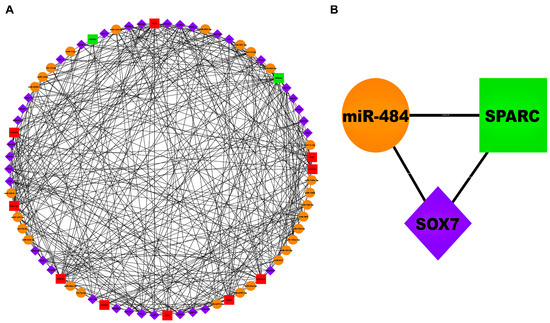 (A) Unweighted and undirected -node miRNA FFL comprising nodes and edges. (B) Highest-order subnetwork motif comprising one TF (SOX7), one miRNA (miR-484), and one mRNA (SPARC). Magenta-colored diamond nodes, orange-colored circular nodes, and green- and red-colored rectangular nodes signify TFs, miRNAs, and mRNAs, respectively.