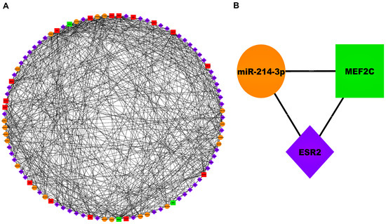 (A) Unweighted and undirected -node miRNA FFL comprising nodes and edges. (B) Highest-order subnetwork motif comprising one TF (ESR2), one miRNA (miR-214-3p), and one mRNA (MEF2C). Magenta-colored diamond nodes, orange-colored circular nodes, and green- and red colored-rectangular nodes signify TFs, miRNAs, and mRNAs, respectively.