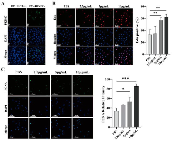 HUVECs proliferation was detected using an EdU assay after 24 h of culture with EVs. A fluorescent microscope was used to observe the samples and obtain images.