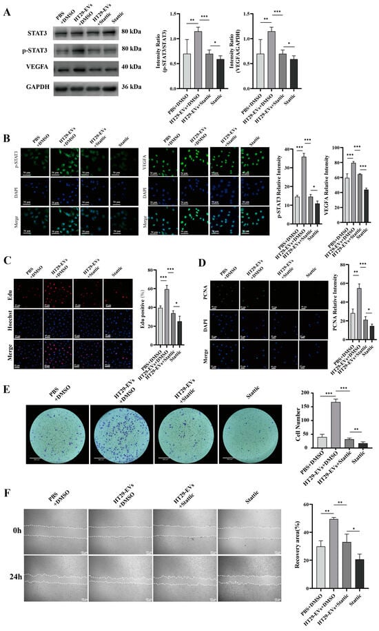 Stattic, a small-molecule inhibitor of STAT3, inhibits the binding of a physiologically relevant tyrosine-phosphorylated peptide motif to the STAT3 SH2 domain and inhibits dimerization and DNA binding of STAT3 [49], preventing STAT3 from entering the nucleus and exerting its function as a transcription factor, subsequently suppressing the expression of downstream genes. The Western blotting results indicate that HT29-EVs promote the phosphorylation of STAT3 without affecting the expression of STAT3, indicating that HT29-EVs activate the activity of STAT3 and promote the expression of downstream VEGFA. At the same time, we observed that Stattic can significantly reduce the proangiogenic effects of HT29-EVs on HUVECs, including proliferation, migration, and tube formation. This phenomenon indicates that adding Stattic inhibits the JAK/STAT3 signaling pathway, consequently restraining the proangiogenic effects of HT29-EVs on VEGFA.