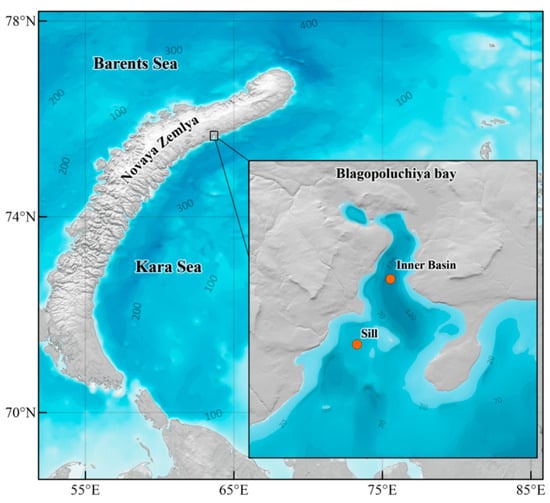 Samples for stable isotope analysis were collected in September–October 2018, 2020, and 2022 during R/V cruises of the Shirshov Institute of Oceanology within the framework of a long-term study, “Ecosystems of the Siberian Arctic Seas”. Samples were collected at two monitoring stations representing the two most common habitats of the bay, and these stations have been sampled several times throughout the years. The Inner Basin station is located in the deepest inner part of the bay at 150–170 m, with high levels of inorganic matter sedimentation; the shallower Sill station, located near the exit of the bay, is at a depth of 63–72 m (Figure 1) and has lower levels of sedimentation, being more connected to the open Kara Sea. The two stations have different benthic communities, with a greater proportion of suspension feeders at the Sill station and a larger proportion of deposit feeders at the Inner Basin station [16].