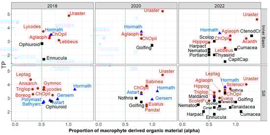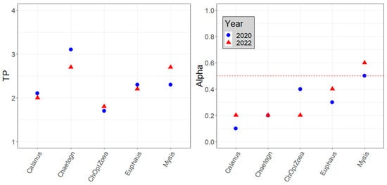 where δ13Cc and δ15Nc are isotopic values of the consumer, δ13Cb1 and δ15Nb1 of benthic macrophytes, and δ13Cb2 and δ15Nb2 of phytoplankton algae, which were selected as the baseline, and their trophic level set to one (λ = 1). Feeding on reprocessed organic matter and macrophytes can raise carbon isotopic ratios of consumers while feeding on fresher pelagic primary production leads to lower δ13C values. This is reflected in the alphas calculated using the full TP model [49,70,71]. Therefore, an alpha of 1 suggests that all of the organic carbon of the consumer is derived from benthic macroalgae sources, while an alpha of 0 indicates that phytoplankton is the primary source.