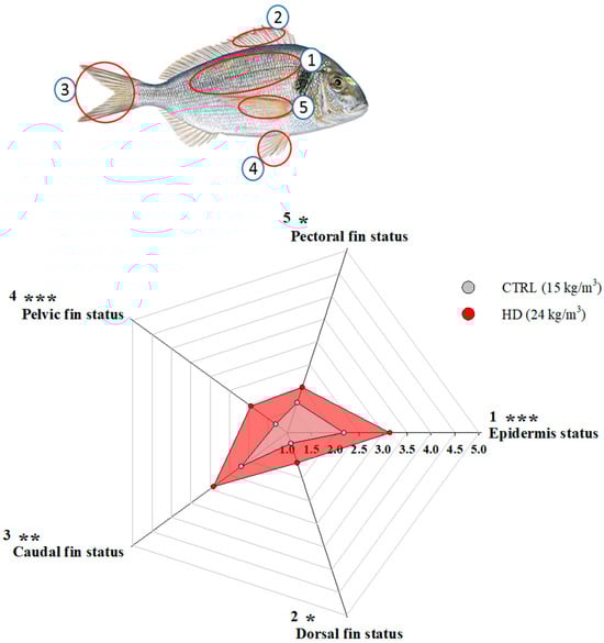 3.2. Effects of High Stocking Density on Growth Performance and Indicators of External Damage