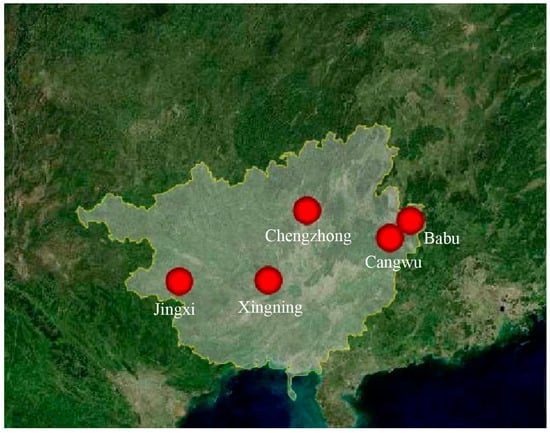 Sample information table of M. alternatus. Note: The location in the picture is within Guangxi Zhuang Autonomous Region, People’s Republic of China (the yellow line). The 5 red circles in the figure represent the 5 collection sites.