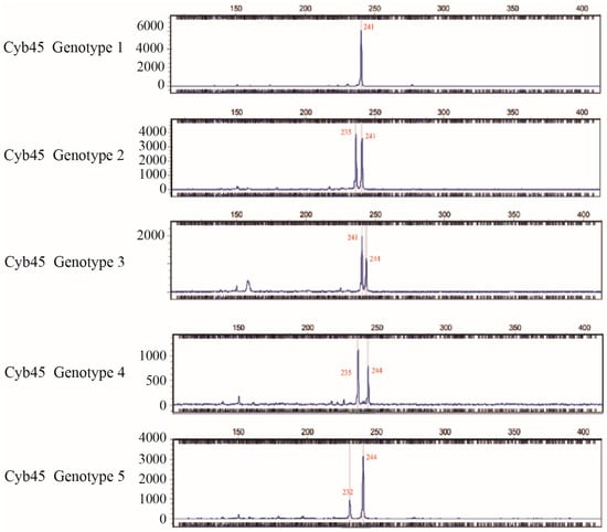 Capillary electrophoresis profile of five genotypes of primer Cyb45. The abscissa represents the allele, and the ordinate represents the peak height.