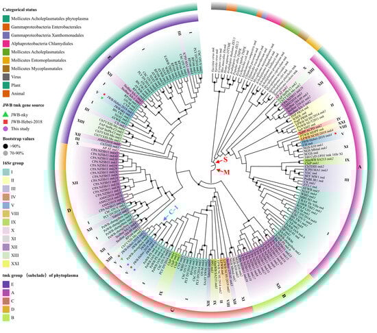 3.2. Three Types of JWB Phytoplasma Strains Were Divided Based on the Tmk Genes